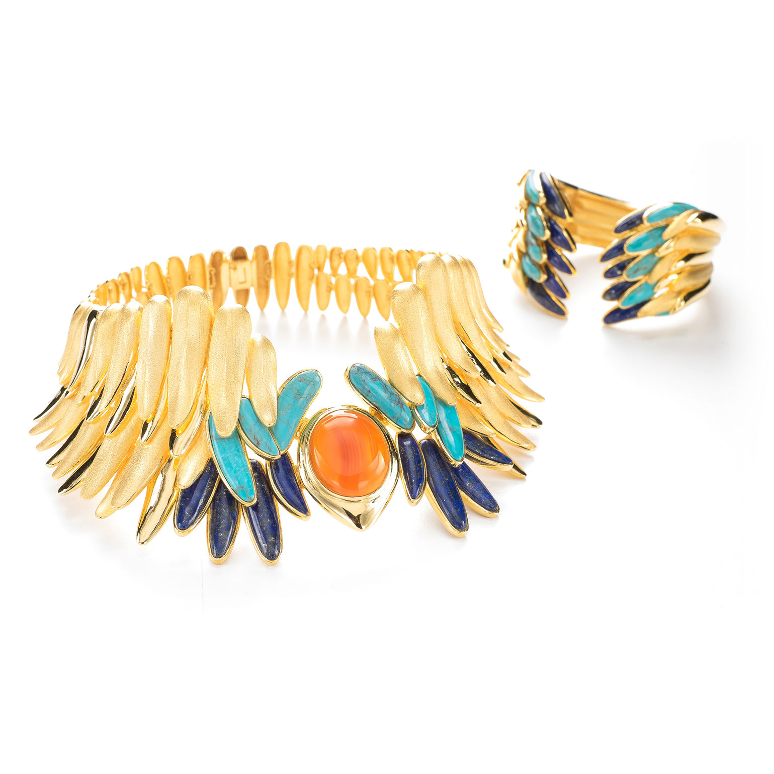 足金頸項及手鐲 設計主題: 古埃及 設計意念: 作品使用了古埃及首飾中常有的翅膀圖案,這都代表著守護著物的聖甲蟲或鳥類。另外,使用了古時常用的半寶石,營造出一種新形態。